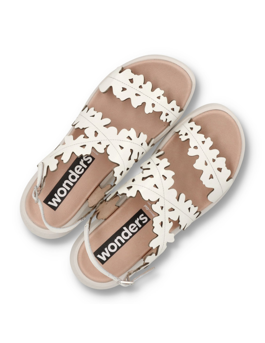 Sandalias planas de mujer C-6551 de wonders. Sandalias planas MAR 51 confeccionadas en piel acabado charol color blancas. Este modelo destaca por su diseño orgánico de tiras troqueladas con silueta floral, que envuelven el empeine aportando personalidad y ligereza visual. Cuenta con cierre mediante hebilla ajustable en el talón, que garantiza una sujeción cómoda y segura. Su suela, creada con tecnología WondersFly™ by XL EXTRALIGHT®, garantiza una ligereza excepcional y un confort extraordinario. Además, la plantilla interior de MemoryGel se adapta perfectamente al pie, proporcionando comodidad en cada paso. Prepárate para sentir la sensación #YesWeFly. Wonders apuesta por una fabricación responsable avalada por LEATHERWORKINGGROUP.
