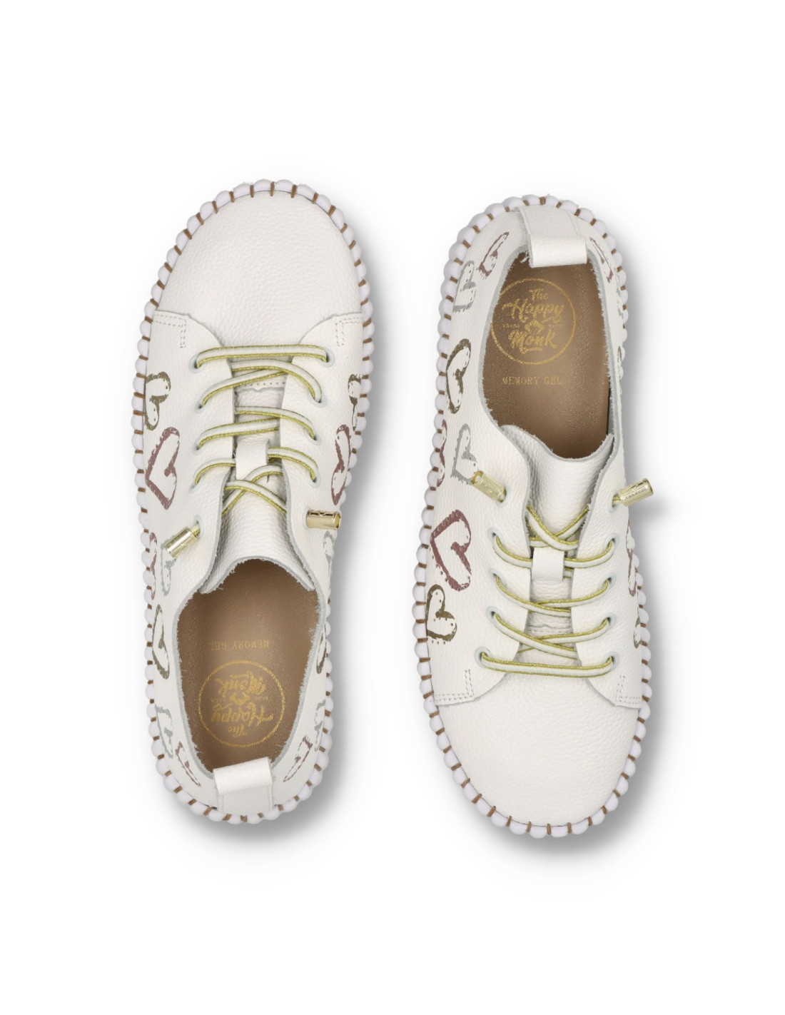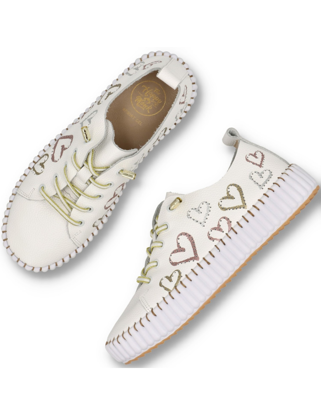 Zapatilla deportiva para mujer THE HAPPY MONK MALLORCA-009,fabricada en piel y con detalles calados, la construcción del piso cosido le confiere un flexibilidad extra. Se presente en color beige y detalles de corazones pintados, para looks urbanos que quieran comodidad en verano.