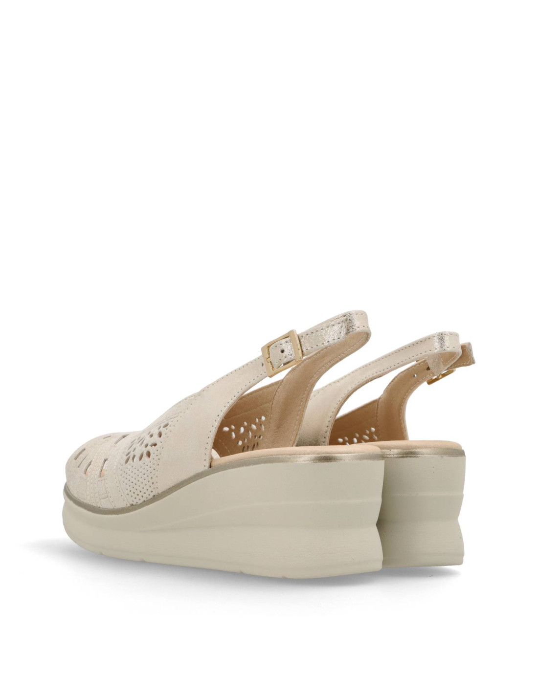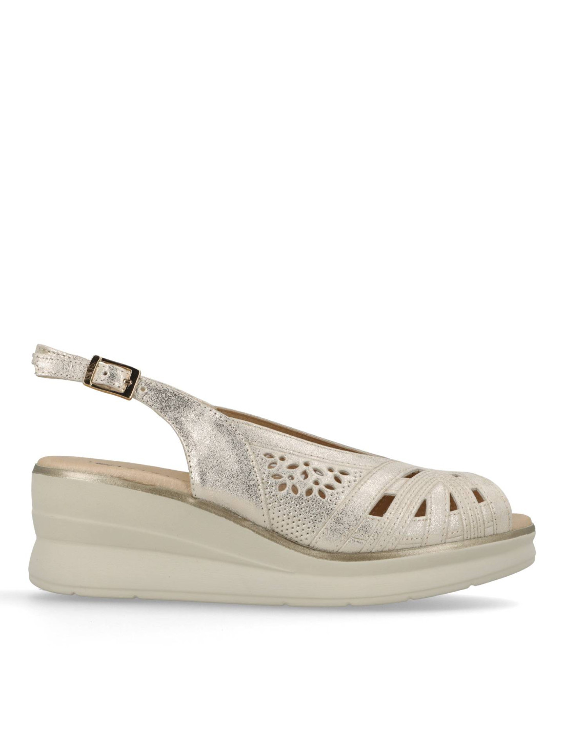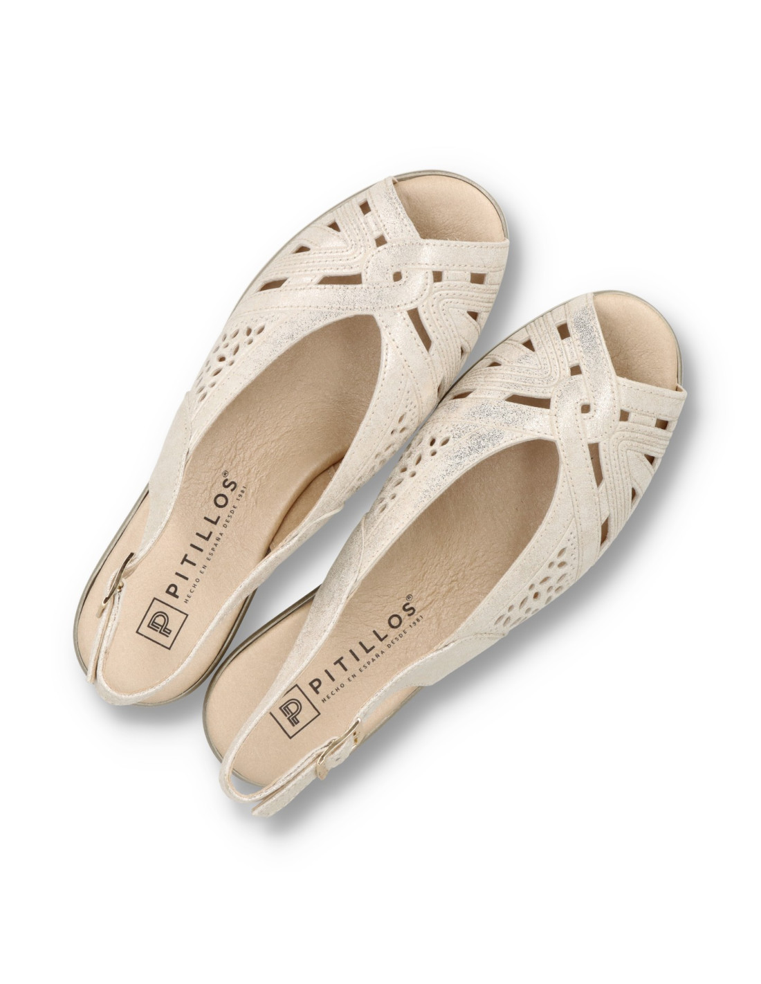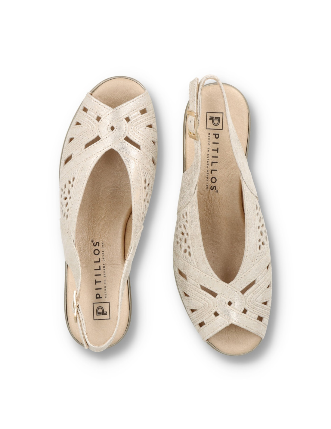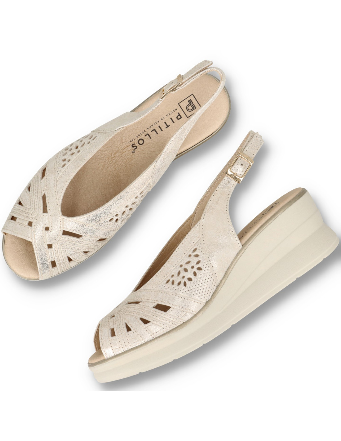 Sandalia de cuña para mujer 11061 de Pitillos. Sandalia plataforma de corte salón con hebilla en piel acabado Oro. Pensada para acompañar los días largos de primavera y verano, esta sandalia Pitillos envuelve el pie con suavidad y aporta un confort estable durante toda la jornada. La horma estudiada de Pitillos y la suavidad de los materiales reducen puntos de presión y favorecen un apoyo natural del pie, haciendo que cada paso sea más cómodo. La plantilla acolchada y el piso ligero ayudan a amortiguar el impacto de la pisada, mientras que los cierres regulables aseguran una sujeción personalizable, perfecta para adaptarse a distintos anchos y necesidades de cada clienta. Gracias a su diseño versátil, es un modelo que funciona igual de bien para la rutina diaria, las jornadas de trabajo, paseos largos o escapadas de fin de semana, manteniendo siempre una estética cuidada y femenina. Fabricado en España, responde al compromiso de Pitillos con la calidad, la durabilidad y el bienestar del pie, para que puedas disfrutar de la temporada con estilo y total tranquilidad.