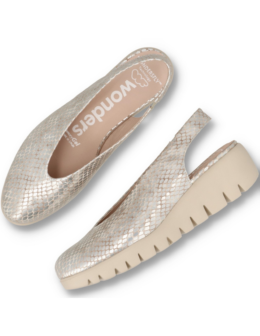 Zapatos de cuña para mujer C-33152 de wonders. Zapato con cuña FLY confeccionado en piel metalizada en color oro. Un modelo clásico y atemporal de escote alto con talón descubierto y punta redonda. Con plantilla memoryGel para una mejor pisada. Suela maxi dentada desarrollada con tecnología WondersFly ™ garantía de ligereza y confort . Prepárate para la sensación, YES WE FLY con nuestro Fly.