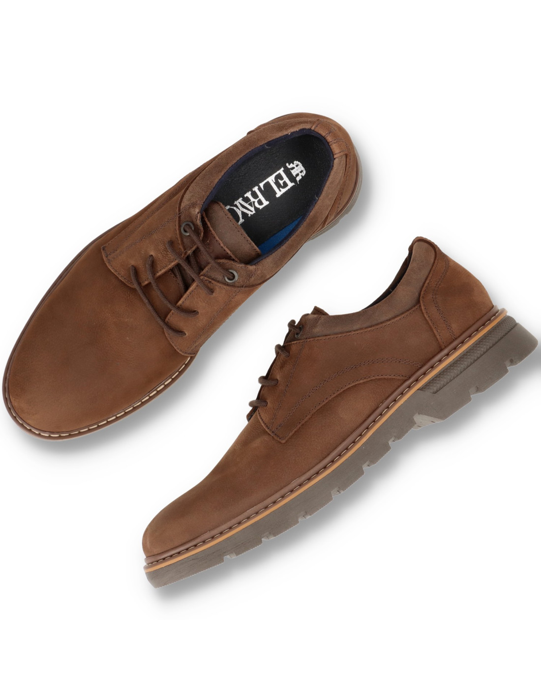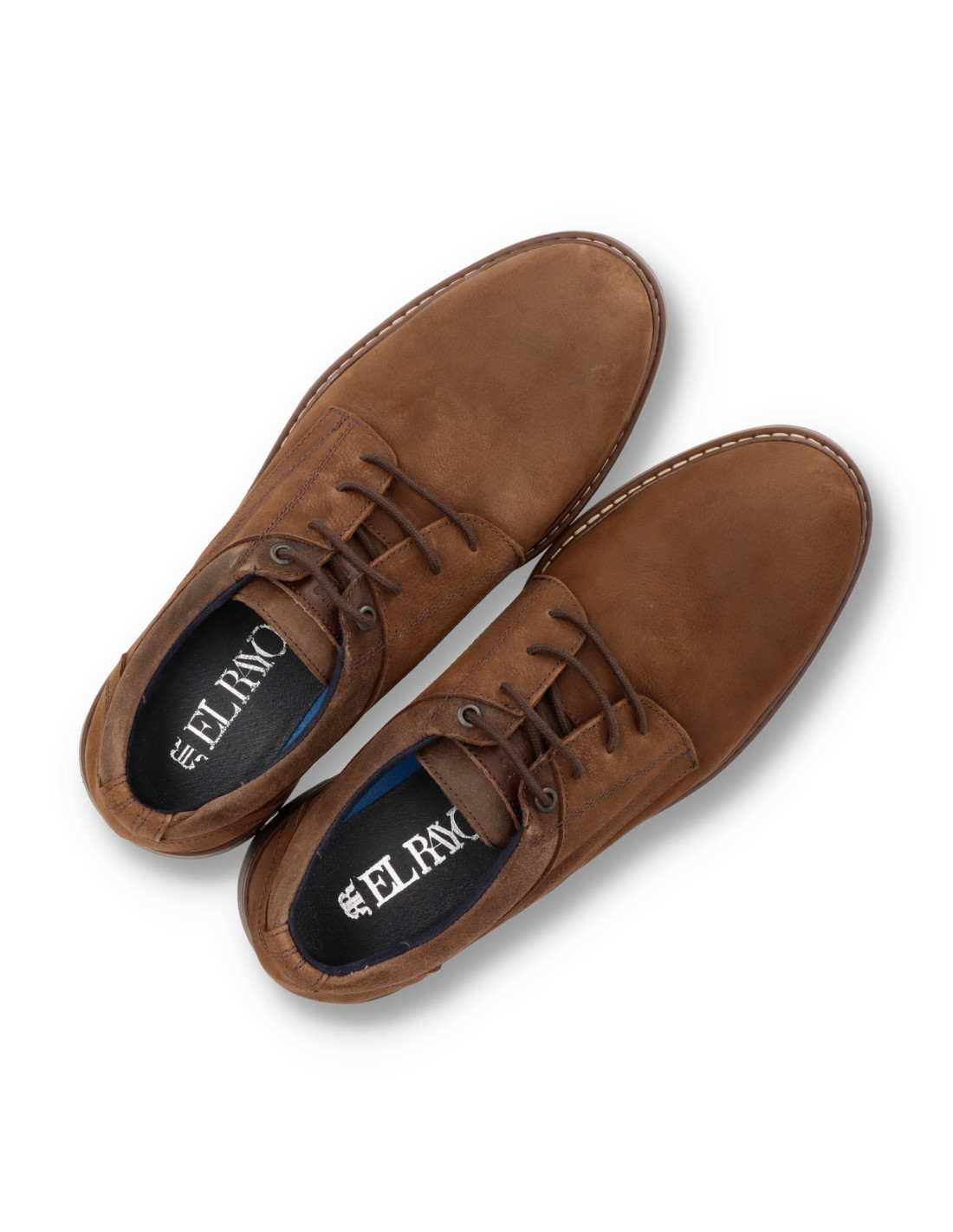 de piel 100%vacuno acabado nobuk engrasado, interior en microfibra y plantilla con tecnologia MemoryFoam. Suela de goma dentada para un mejor agarre, cosida y con cerco de pespuntedado.HECHO EN ESPAÑA