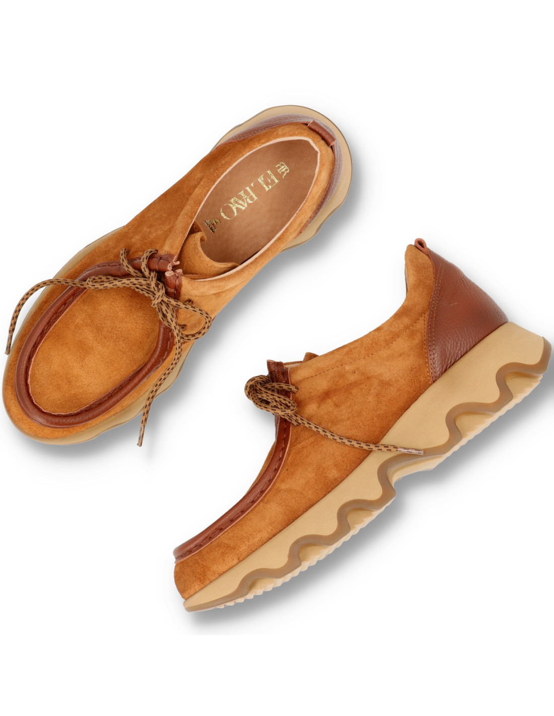 Zapato de mujer mocasín estilo Wallabee 51017 de RAYO TRENDS. De piel 100%Serraje y detalles en piel flor contrastada. Interior de piel con plantilla Memory Foam, para una pisada más confortable. Cierre de cordones, piso de goma bicolor tipo bloque de unos 3cm de grosor. Un modelo pensado para mujeres que buscan un zapato cómodo, elegante y con personalidad. HECHO EN ESPAÑA