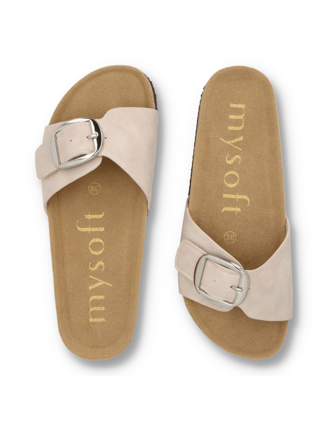 Sandalias planas para mujer 25M077 de Mysoft. Sandalias tipo uggly con pala detalle hebilla. De PU Leather-piel ecológica acabado nobuk, planta con tecnología SoftGel, que garantiza comodidad desde la primera puesta. Suela de goma